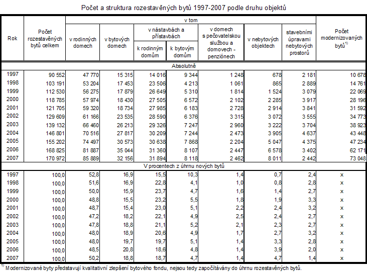 Z celkového počtu 170 972 bytů rozestavěných koncem roku 2007 připadal největší podíl 50,2 % na novostavby rodinných domů, 18,7 % bytů bylo rozestavěno formou nástaveb a přístaveb k rodinným domům. V bytových domech bylo vzhledem k mnohem kratší době jejich výstavby rozestavěno podstatně méně bytů, konkrétně 18,8 % v novostavbách bytových domů a 4,7 % v nástavbách a přístavbách k bytovým domům. Zbytek rozestavěných bytů připadal na ostatní druhy budov, v nichž byly nové byty stavěny.