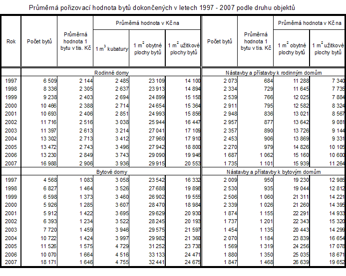 Jelikož údaj o průměrné pořizovací hodnotě jednoho bytu zastírá rozdíly v objemové i plošné velikosti jednotlivých bytů či domů, je pro posouzení vývoje cen výstavby objektivnější přepočíst celkovou pořizovací hodnotu na plošnou, popř. objemovou jednotku nového bytu. Pořizovací hodnota za 1 m3 kubatury, která je důležitým ekonomickým ukazatelem pro stavebníky, rostla od roku 1997 ještě rychleji než průměrné náklady na pořízení jednoho bytu. V roce 2007 byla cena 1 m3 3 936 Kč u rodinných domů, u domů bytových byla průměrná cena 1 m3 4 755 Kč, což značí mírný nárůst v obou kategoriích. Oproti tomu pokles zaznamenala průměrná cena 1m2 obytné plochy v bytových domech, která byla 32 441 Kč, což je ve srovnání s rokem 2006 o 2,1 % méně.