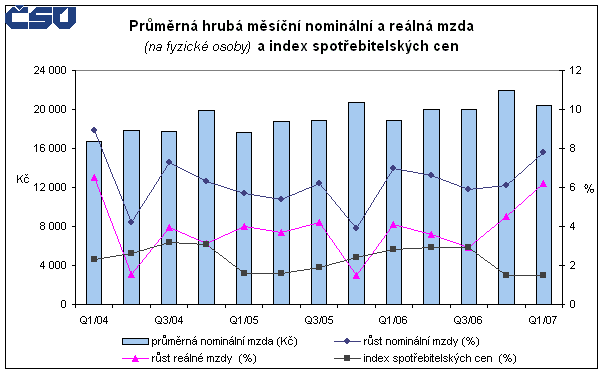 Vývoj reálné mzdy je ovlivněn spolupůsobením dvou faktorů. Vedle růstu nominálních mezd je to ještě růst cenové úrovně (inflace) vyjádřený indexem spotřebitelských cen (ISC). Porovnáme-li opět 1. čtvrtletí 2004 a 1. čtvrtletí 2007, zjistíme, že velmi vysoký meziroční relativní přírůstek nominální mzdy v 1. čtvrtletí roku 2004 (8,9 %) představoval růst reálné mzdy o 6,5 %, zatímco přírůstek nominální mzdy dosažený v 1. čtvrtletí 2007 (7,8 %) zvýšil reálné mzdy téměř stejně výrazně, a to o 6,2 %. Stalo se tak vlivem inflace, která před třemi lety činila 2,3 %, v letošním 1. čtvrtletí 1,5 % (viz graf č. 1, podrobné informace na /produkty/pmz_cr).