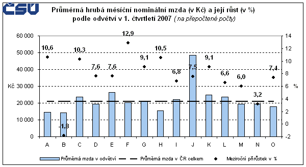 Rozdíly mzdové úrovně a temp jejího růstu mezi jednotlivými odvětvími (sekce OKEČ) dobře charakterizuje graf č. 3. Z něj je patrné, že nejnižší mzdové úrovně v 1. čtvrtletí 2007 dosahovala odvětví: rybolov a chov ryb (14 240 Kč); zemědělství a myslivost, lesnictví; ubytování a stravování. Naopak nejvyšší mzdové úrovně dosáhla odvětví: finanční zprostředkování (48 554 Kč); výroba a rozvod elektřiny, plynu a vody; činnosti v oblasti nemovitostí a pronájmu, podnikatelské činnosti. S výjimkou rybolovu a chovu ryb zaznamenala odvětví s nízkou úrovní mzdy velmi vysoké meziroční relativní přírůstky. Nejvyšší relativní přírůstek byl zjištěn v odvětví stavebnictví (12,9 %), významnými faktory tohoto výrazného nárůstu byly již zmíněné neobvyklé klimatické podmínky.