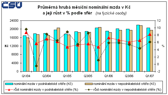 Relativní meziroční přírůstek průměrné nominální mzdy za 1. čtvrtletí 2007 (7,8 %) patří k nejvyšším od 2. čtvrtletí 2002 (7,8 %). Jedinou výjimkou v tomto období bylo 1. čtvrtletí 2004 (8,9 %), kdy se na vysokém tempu růstu průměrné mzdy významně podílel i vývoj platů v nepodnikatelské sféře (nepodnikatelská 9,6 %, podnikatelská 8,7 %), kde došlo k úpravě platových poměrů přechodem z dvanáctitřídní stupnice platových tarifů na šestnáctitřídní. V letošním 1. čtvrtletí rostly mzdy rychleji ve sféře podnikatelské. Pokračující hospodářský růst patrně umožňuje podnikům lépe finančně ohodnotit své zaměstnance. Nezanedbatelným faktorem působícím na růst mezd v letošním 1. čtvrtletí je jistě i to, že byla velmi mírná zima, zatímco ve srovnatelném období předchozího roku byly klimatické podmínky naopak velmi nepříznivé, a práce zejména ve stavebnictví (a následně i v navazujících odvětvích) tak v letošním roce mohly probíhat bez významnějšího sezónního výkyvu.