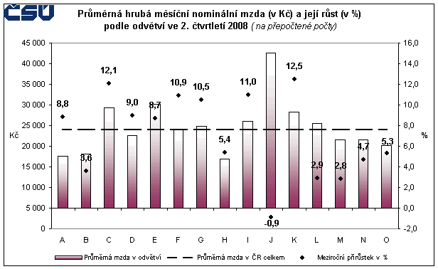 Nominální průměrná hrubá měsíční mzda na přepočtené počty v 2. čtvrtletí 2008 činila 23 928 Kč, tj. meziročně o 1 777 Kč, resp. 8,0 % více. V podnikatelské sféře se zvýšila o 2 074 Kč, tj. 9,3 %, průměrná mzda činila 24 267 Kč, v nepodnikatelské sféře vzrostla o 668 Kč, tj. o 3,0 % a dosáhla 22 664 Kč. Reálná mzda meziročně vzrostla celkem o 1,1 %, v podnikatelské sféře o 2,3 %, v nepodnikatelské poklesla o 3,6 %.