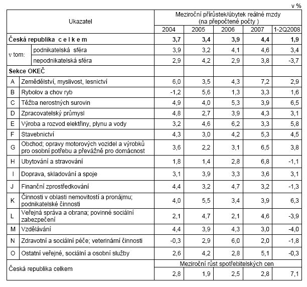 Vývoj reálné mzdy je vedle růstu nominálních mezd ovlivněn ještě růstem cenové úrovně (inflace) vyjádřené indexem spotřebitelských cen. Spotřebitelské ceny se zvýšily v 2. čtvrtletí o 6,8 %, v důsledku čehož byla významná část poměrně vysokého mzdového růstu znehodnocena rostoucími cenami a reálná mzda tak meziročně vzrostla pouze o 1,1 %. Jedná se tak o nejnižší růst reálné mzdy od roku 1998. V podnikatelské sféře se reálná mzda zvýšila o 2,3 %. V předchozích letech se hlouběji propadla pouze ve 4. čtvrtletí loňského roku (růst o 1,6 %), kdy již začínala významněji narůstat inflace. Stejně nízké hodnoty přírůstku pak dosáhla reálná mzda v podnikatelské sféře ještě ve 4. čtvrtletí 2005, tehdy ale při podstatně nižším mzdovém růstu i inflaci. V nepodnikatelské sféře se ve 2. čtvrtletí 2008 nízký mzdový růst a vysoká inflace podílely na poměrně výrazném propadu reálných mezd, a to o 3,6 %. Ke zvyšování platů v nepodnikatelské sféře dochází v závislosti na legislativních opatřeních vlády a možnostech státního rozpočtu, tedy spíše skokově než plynule. Občas, i když v posledních letech spíše výjimečně, proto k propadům reálných mezd v této sféře docházelo. K většímu znehodnocení platů než v letošním 2. čtvrtletí (s výjimkou předchozího čtvrtletí) došlo v nepodnikatelské sféře naposledy ve 3. čtvrtletí 1998.