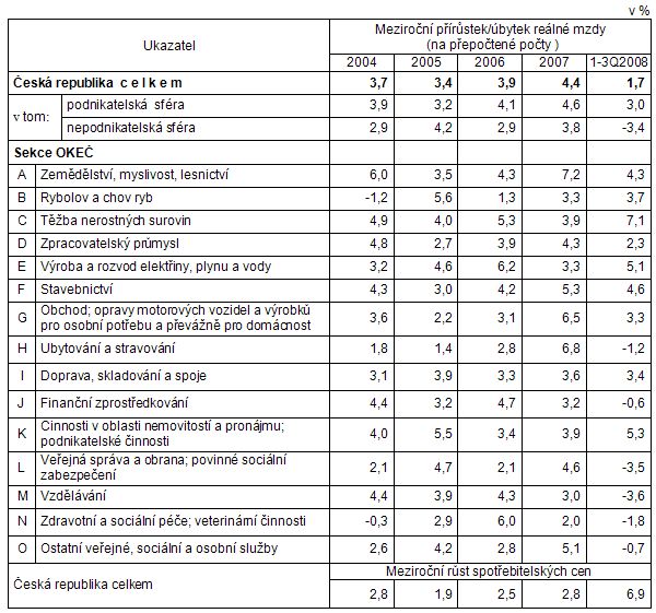 Vývoj reálné mzdy je vedle růstu nominálních mezd ovlivněn ještě růstem cenové úrovně (inflace) vyjádřené indexem spotřebitelských cen. Od 4. čtvrtletí 2007, ale zejména ve všech třech čtvrtletích roku 2008, byla poměrně významná část mzdového růstu znehodnocována rostoucími cenami. Ve 3. čtvrtletí 2008 se spotřebitelské ceny zvýšily o 6,6 % a celková reálná mzda tak meziročně vzrostla pouze o 1,2 %. Od roku 1998 je to druhý nejnižší přírůstek reálné mzdy, ještě o 0,1 proc. bodu nižší byl zaznamenán ve 2. čtvrtletí letošního roku. V podnikatelské sféře se reálná mzda ve 3. čtvrtletí zvýšila o 2,3 %, tj. rostla stejným tempem jako v předchozím čtvrtletí. V nepodnikatelské sféře se nízký mzdový růst a vysoká inflace podílely na poměrně výrazném poklesu reálných mezd, a to o 2,7 %. Proti předchozímu čtvrtletí se ale propad poněkud zmírnil.