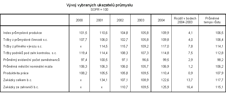 Průmysl v roce 2004 pokračoval ve výrazném růstu a navázal tak na trend z předchozích let. Zvýšila se průmyslová produkce, tržby i přímý vývoz průmyslových podniků. Zvýšila se rovněž produktivita práce i průměrné nominální mzdy.