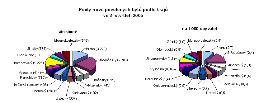 Stavební úřady povolily ve 3. čtvrtletí 2005 výstavbu 12 919 nových bytů, což je o 23,6 % více než ve stejném období roku 2004. Novou výstavbou bude získáno 11 027 bytů (o 34,5 % více) a jde především o byty v bytových budovách (10 752 byty). Změnami dokončených staveb byl povolen vznik 1 892 bytů (o 16,1 % méně). Z celkového počtu nově povolených bytů bude postaveno v bytových budovách 12 089 bytů, což je o 2 292 byty více.