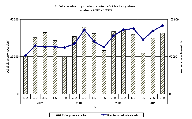 Stavební úřady vydaly ve 3. čtvrtletí 41 086 stavebních povolení, což je o 3,6 % méně než ve stejném období roku 2004. Orientační hodnota povolených staveb dosáhla 91,6 mld. Kč, což je o 6,3 % více než ve stejném období roku 2004.