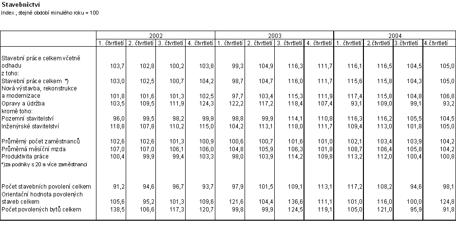 Stavebnictví v roce 2004 zaznamenalo růst, který byl v jednotlivých čtvrtletích roku diferencovaný. Stavební výroba meziročně reálně vzrostla o 9,7 %, nejvíce od roku 1993, ( v 1.čtvrtletí 2004 vzrostla o 16,1 %, ve 2.čtvrtletí vzrostla o 16,5 %, ve 3.čtvrtletí pouze o 4,5 % a ve 4.čtvrtletí o 5,0 %).