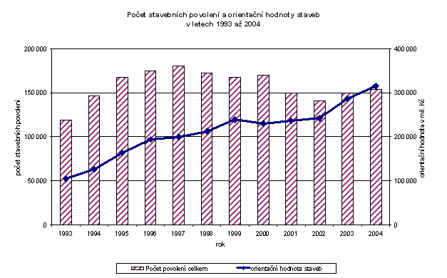 Stavební úřady v roce 2004 vydaly 153 622 stavebních povolení, což bylo o 2,9 % více než v roce 2003. Orientační hodnota nově povolených staveb dosáhla 315,1 mld. Kč, což bylo o 10,1 % více než v roce 2003.
