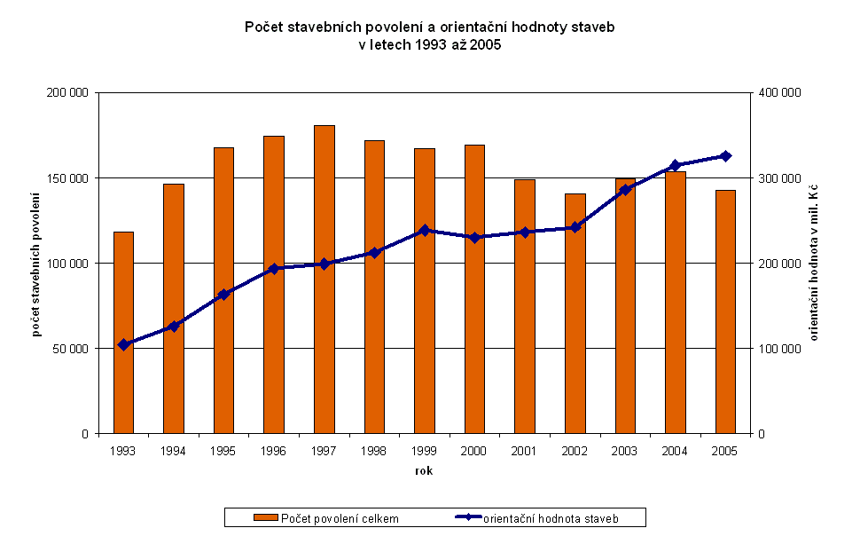 Stavební úřady v roce 2005 vydaly 142 941 stavebních povolení, což bylo o 7,0 % méně než v roce 2004. Orientační hodnota nově povolených staveb dosáhla 325,8 mld. Kč, což bylo o 3,4 % více než v roce 2004 (v 1.čtvrtletí 72,8 mld.Kč, ve 2.čtvrtletí 84,5 mld.Kč, ve 3.čtvrtletí 91,6 mld.Kč a ve 4.čtvrtletí 76,9 mld. Kč).