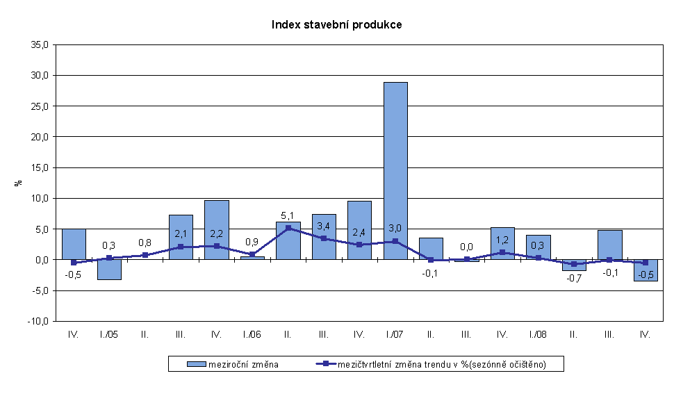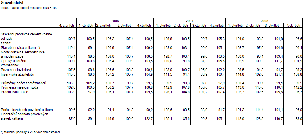 Celková stavební produkce ve 4. čtvrtletí 2008 meziročně klesla ve stálých cenách o 3,4 %. Po vyloučení vlivu počtu pracovních dní klesla o 2,6 % (ve 4. čtvrtletí 2008 bylo meziročně o 2 pracovní dny méně). Ve srovnání se stejným obdobím 2007 se zvýšily objemy stavebních prací u nové výstavby, rekonstrukcí a modernizací u inženýrského stavitelství. Naopak pozemní stavitelství vykazovalo trvalý pokles. V ostatních směrech výstavby (opravy a údržba, ostatní práce) došlo k nárůstu stavebních prací až na práce v zahraničí, kde produkce poklesla o 25,3 %.