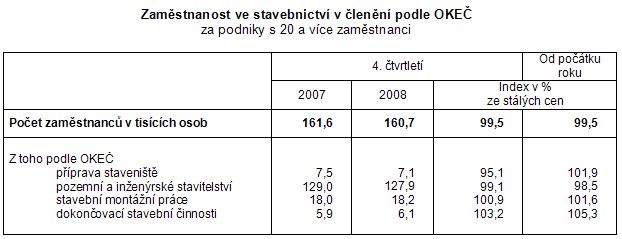 Průměrný evidenční počet zaměstnanců pracujících ve stavebních podnicích, které ve 4. čtvrtletí 2008 měly 20 a více zaměstnanců, byl 160,7 tisíc osob, z toho manuálně pracujících bylo 99,9 tisíc osob (o 1,0 % méně).