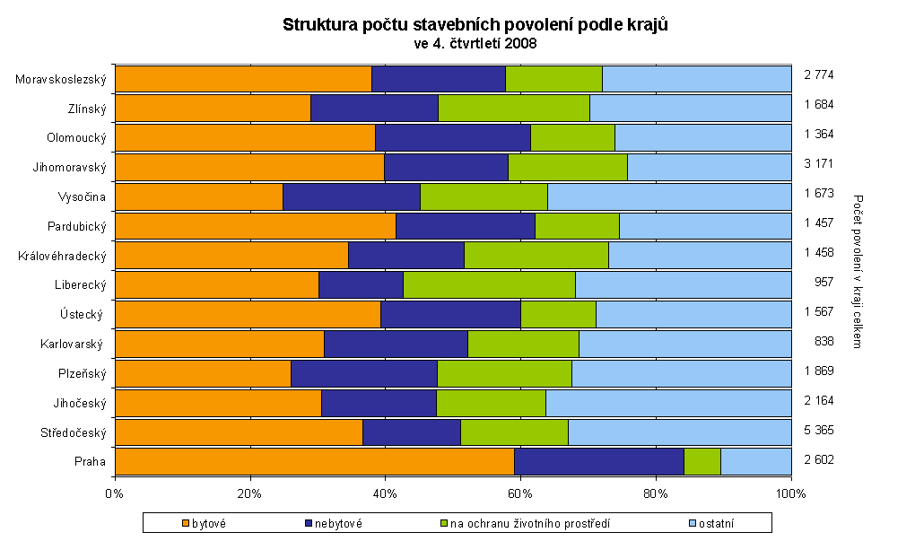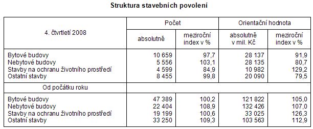 Stavební úřady ve 4. čtvrtletí 2008 vydaly 29 269 stavebních povolení, což bylo o 3,1 % méně než ve 4. čtvrtletí 2007. Počet povolení vzrostl u nebytových budov o 3,1 % a klesl u staveb na ochranu životního prostředí o 15,1 %, u bytových budov o 2,3 % a u staveb ostatních o 0,2 %.