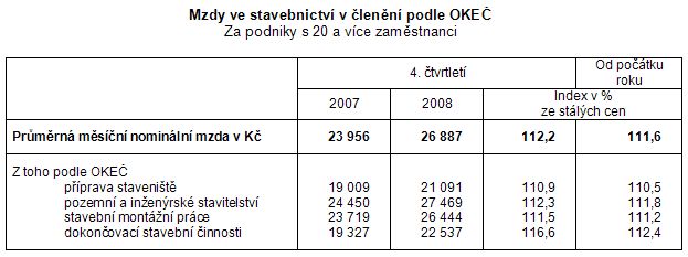 Průměrná měsíční nominální mzda zaměstnanců ve stavebních podnicích s 20 a více zaměstnanci ve 4. čtvrtletí 2008 dosáhla 26 887 Kč a byla o 12,2 % vyšší proti stejnému období roku 2007. Hodinová mzda činila 191 Kč a byla vyšší o 15,8 %.