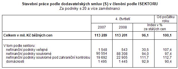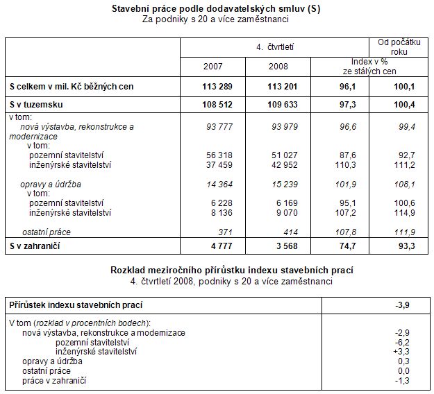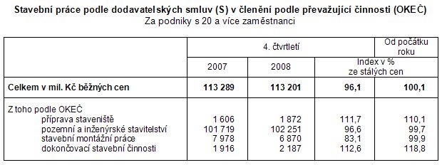 Ve 4. čtvrtletí roku 2008 byly provedeny stavební práce za 151 227 mil. Kč. Stavební produkce malých podniků (do 19 zaměstnanců) činila podle odhadu ČSÚ přibližně čtvrtinu z celkového objemu stavebních prací. Rozhodující podnikovou základnu stavebnictví tvořilo 2 510 podniků s 20 a více zaměstnanci, které provedly stavební práce za 113 201 mil. Kč, tj. o 3,9 % méně než ve 4. čtvrtletí roku 2007.