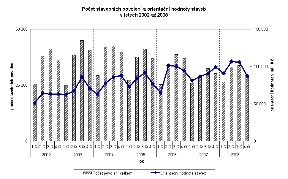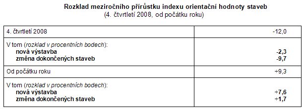Orientační hodnota staveb povolených ve 4. čtvrtletí 2008 byla 87,3 mld. Kč a ve srovnání se stejným obdobím roku 2007 klesla o 12,0 %. Novou výstavbou vzniknou stavby v hodnotě 60,4 mld. Kč, což představuje meziroční pokles o 3,6 %. Změnou dokončených staveb vzniknou stavby v hodnotě 26,9 mld. Kč, což je o 26,4 % méně než ve stejném období minulého roku.