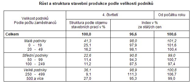 Z hlediska velikosti podniku, stanovené podle počtu zaměstnanců, byl zaznamenán pokles objemu stavebních prací u malých podniků o 2,0 %, u středních o 9,2 % a u velkých podniků o 1,1 %.