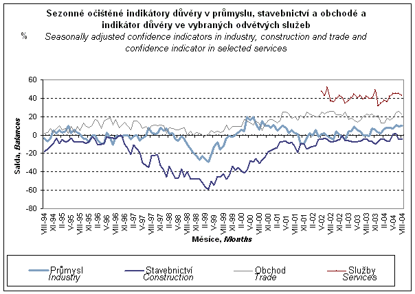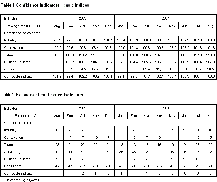 In August 2004 , the composite confidence indicator balance and the consumer confidence indicator balance remained unchanged month-on-month; the business confidence indicator balance dropped slightly, due to a decrease in the confidence indicator in trade. The confidence indicators reach favourable values in the long term.