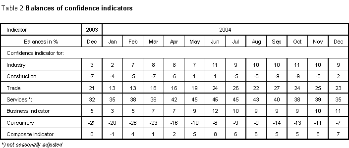 The composite confidence indicator balance increased in December 2004 compared to the previous month, which was caused by increases in both the business confidence indicator balance, especially in construction, and the consumer confidence indicator balance. Compared to December 2003, the business confidence indicator increased by 6 points, the consumer confidence indicator by 14 points and the composite confidence indicator by 7 points.
