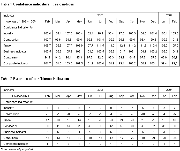 In February 2004 the balance of business indicator increased compared to the previous month. Its value was positively influenced primarily by the confidence indicator in industry. The consumer confidence indicator dropped, namely due to the influence of all its parts. On the whole, the composite confidence indicator balance remained unchanged compared to the previous month.