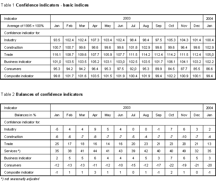 In January 2004 the composite confidence indicator balance slightly decreased compared to the previous month, namely to the same level as in January 2003. This decrease was caused primarily by a marked decrease of confidence indicator in trade and a long-term lower level of the consumer indicator. Confidence indicator in construction positively influenced the value of the composite indicator.