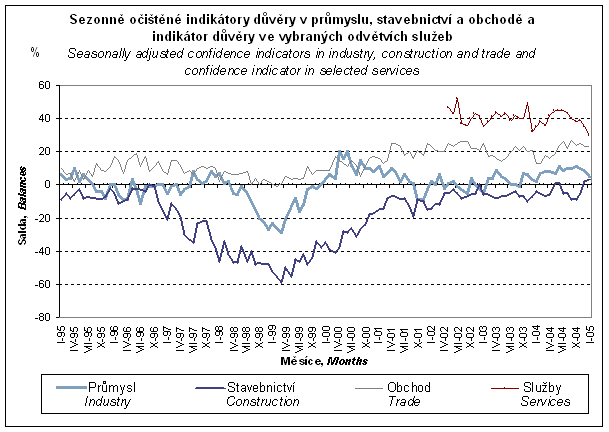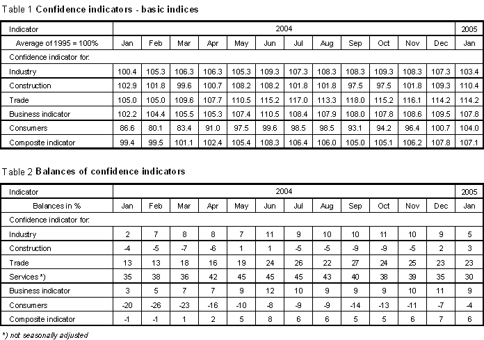 The composite confidence indicator balance decreased in January 2005 compared to the previous month, which was caused by a decrease in the business confidence indicator balance. The consumer confidence indicator balance increased. However, in the year-on-year comparison, the business confidence indicator was higher by 6 points, the consumer confidence indicator by 16 points and the composite confidence indicator by 7 points.
