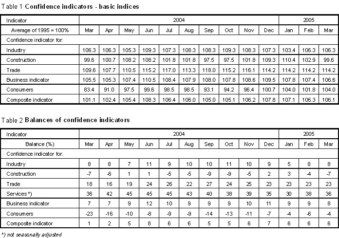 The composite confidence indicator balance did not change in March 2005 compared to the previous month; the business confidence indicator balance decreased by 1 point and the consumer confidence indicator balance, on the contrary, increased by 2 points. In comparison to March 2004, the business confidence indicator balance was higher by 1 point, the balance of consumer confidence indicator by 19 points and the balance of composite confidence indicator by 5 points.