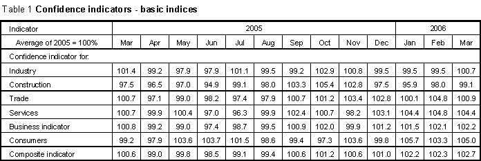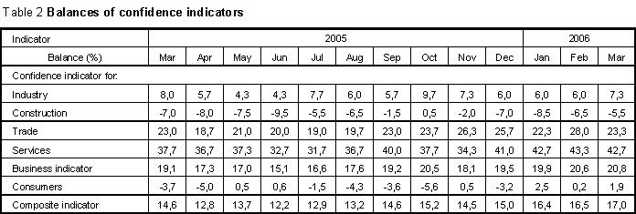 Balance of composite confidence indicator (indicator of economic sentiment) increased by 0.5 point in March 2006 compared to the previous month. Balance of business indicator increased by 0.2 point. Balance of consumer confidence indicator increased by 1.7 points. Compared to March 2005, composite confidence indicator balance increased by 2.4 points, business confidence indicator balance increased by 1.7 points and consumer confidence indicator balance increased by 5.6 points.