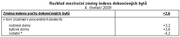 Ve 4. čtvrtletí 2009 byla dokončena výstavba 12 722 bytů, meziročně o 2,6 % více. Nejvíce nových bytů bylo dokončeno v rodinných domech (7 152 bytů), což oproti 4. čtvrtletí roku 2008 znamená nárůst o 6,0 %. V bytových domech bylo dokončeno 4 101 bytů, meziročně o 12,4 % více. Vzrostl také počet bytů dokončených v nebytových budovách a v přístavbách, nástavbách a vestavbách k bytovým domům. Ve všech ostatních kategoriích došlo k poklesu.