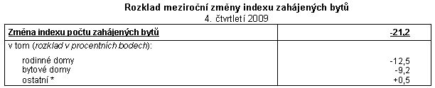 Ve 4. čtvrtletí 2009 byla zahájena výstavba 7 628 bytů, což ve srovnání se 4. čtvrtletím roku 2008 představuje pokles o 21,2 %. Nejvíce bytů bylo zahájeno v rodinných domech (4 197 bytů), jejich počet však meziročně poklesl o 22,3 %. V bytových domech byla zahájena výstavba 1 719 bytů, což v meziročním srovnání představuje pokles o 34,0 %. Rovněž poklesl počet zahájených bytů v obou formách přístaveb, nástaveb a vestaveb. V ostatních kategoriích byl zaznamenán nárůst.