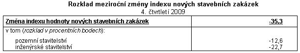Ve 4. čtvrtletí 2009 uzavřely sledované stavební podniky v tuzemsku 7 583 nových stavebních zakázek, což představuje meziroční nárůst o 10,4 %. Celková hodnota těchto zakázek meziročně klesla o 35,3 % a činila 47,8 mld. Kč, na pozemním stavitelství 19,0 mld. Kč (-32,9 %) a na inženýrském stavitelství 28,8 mld. Kč (-36,7 %). Průměrná hodnota nově uzavřené stavební zakázky ve 4. čtvrtletí 2009 činila 6,3 mil. Kč a byla meziročně o 41,4 % nižší.