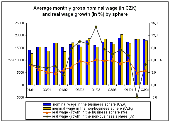 Over Q1 to Q3 2004, the average wage per actual persons stood at CZK 17 418 – an increase of CZK 1 092 (+6.7%) compared to the corresponding period of 2003. In the same period consumer prices rose by 2.7% and the real wage by 3.9%. The business sphere raised its average wage by CZK 1 162 (+7.1%) to CZK 17 599 and the real wage increased by 4.3%. In the non-business sphere the average wage and the real wage increased by 5.4% (+CZK 861) to CZK 16 808) and 2.6%, respectively.