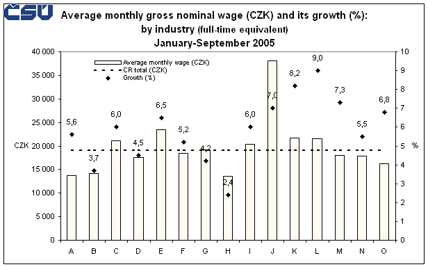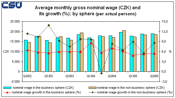 In Q1-Q3 2005, the wage growth amounted to 5.9% (nominal wage being CZK 18 996) in the whole country, 5.3% (CZK 18 957) in the business sphere and 8.0% (CZK 19 134) in the non-business sphere. The real wage increased by 4.1% year-on-year and its increase is based on 3.5% growth in the business sphere and 6.2% growth in the non-business sphere.