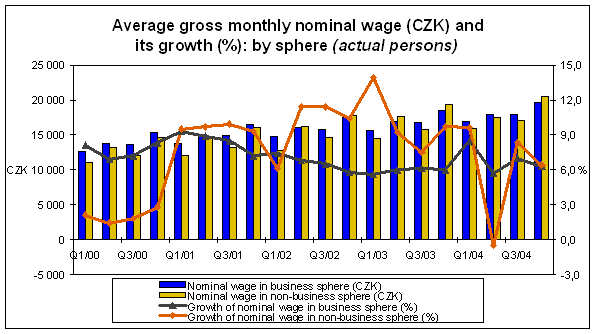 In the year 2004, the average wage per FTE employee amounted to CZK 18 582, which is by CZK 1 136 (6.5%) up on the year 2003. In the same period, consumer prices went up by 2.8% and the real wage by 3.6%. In the business sphere the average wage rose by CZK 1 169 (+6.7%) to CZK 18 544 and the real wage by 3.8%. In the non-business sphere the average wage rose by CZK 1 022 (+5.8%) to CZK 18 713 and the real wage by 2.9%.