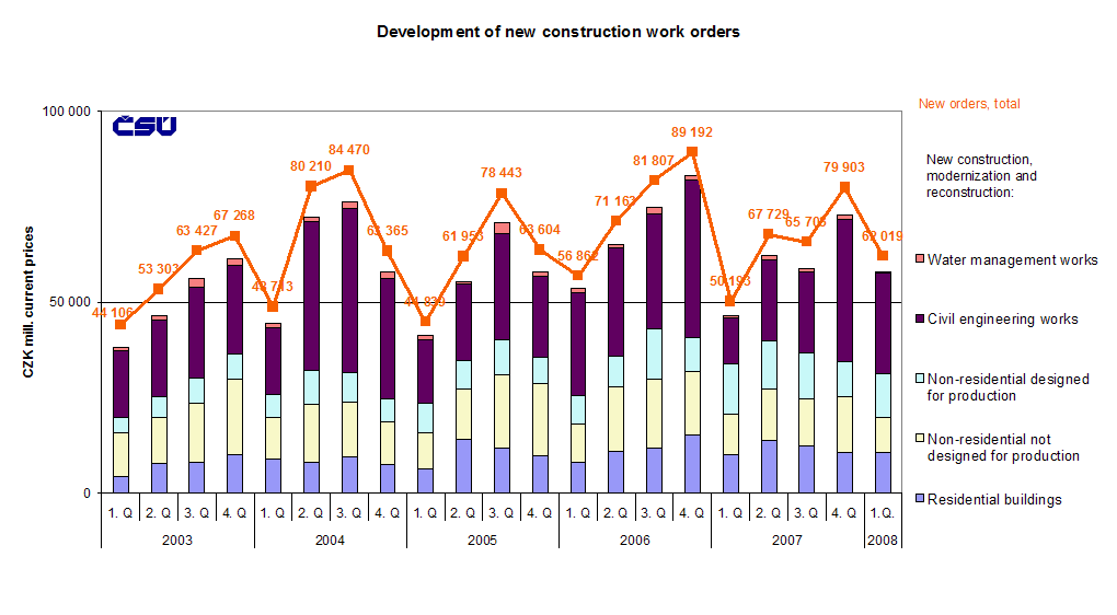 The total value of construction orders reached CZK 205.2 billion at the end of Q1 2008. In comparison to the end of Q4 2007 the value and number of construction orders increased.