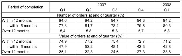 Out of the total number of construction orders recorded at the end of Q1 2008, four fifths will be completed within 6 months and 94.2% within a year. From the total value of construction orders, more than two fifths will be completed within 6 months and 71.2% within a year. The value of construction orders recorded on 31 March 2008 amounting to CZK 205.2 billion represents a seven-and-half months reserve of work for construction enterprises. In comparison to the end of Q4 2007 the reserve of work increased by half a month.