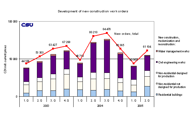 In Q2 2005 construction enterprises contracted 24 361 new construction work orders. worth about CZK 61.1 billion, which translates into a decrease of 23.8 % y-o-y. The decrease was partially influenced by the high reference basis of the 2 nd quarter of 2004 when contracts entered into included the lowered VAT (before its change). Also change of structure expressed thanks considerable decrease of new orders in the civil engineering works.
