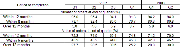 Out of the total number of construction orders recorded at the end of Q2 2008, four fifths will be completed within 6 months and 94.0% within a year. From the total value of construction orders, roughly a half will be completed within 6 months and 70.0% within a year. The value of construction orders recorded on 30 June 2008 amounting to CZK 213.4 billion represented a nearly eight months reserve of work for construction enterprises. In comparison to the end of Q1 2008 the reserve of work increased by half a month.