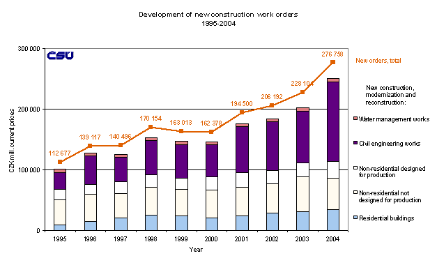 The average value of domestic new construction work orders was CZK 3.2 million in 2004.