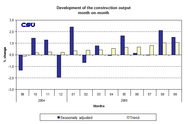 In September 2005, seasonally adjusted construction output at constant prices was 1.5% up month-on-month. The trend increased by 1.0% month-on-month (see Table 3). The development of the trend component indicates that construction has accelerated its growth in the course of this year.