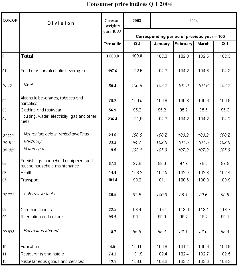 After very moderate price growth in 2003 consumer prices in the first quarter of 2004 accelerated their month-on-month and year-on-year growth. This development was caused by a distinctive month-on-month price increase in January 2004 by 1.8% (January 2003 growth was only +0.6%). In February and March the price development was similar to that of 2003. Price jump in January was influenced both by administrative measures and an increase in market prices. Administrative influences were: a VAT increase, primarily at public telecommunication services, an increase of consumer taxes for automotive fuels and spirits, and an increase of regulated prices (especially electricity and natural gas). Tobacco, for which consumer tax was also increased, was sold during the entire first quarter from the stock for an unchanged price. Development of market prices was influenced primarily by an increase of food prices, which was the most distinctive in January, while February prices of food slightly decreased after growing for five months and in March they slightly increased.