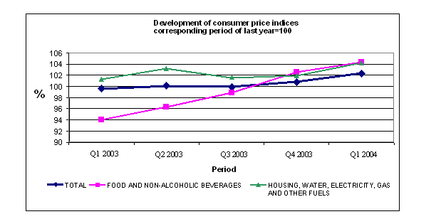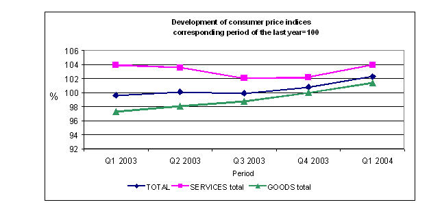 Prices of goods in total (after stagnation in the fourth quarter of 2003) grew by 1.4%, prices of services increased by 4.0%. Growth of prices of services was influenced in the first quarter of 2004 primarily by an increase of prices of telecommunication services due to the higher VAT.