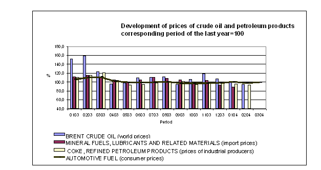 Similarly, development of transport prices was influenced primarily by an increase of prices of automotive fuels in January as a result of a higher consumer tax. In March another month-on-month price increase occurred. Despite the increases, prices of automotive fuels remained in the first quarter of 2004 y-o-y by 0.5% lower than in the corresponding period of 2003. At domestic producers of refined petroleum products prices decreased in January and even more decreased in February. Similar development was observed also at import prices of mineral fuels and mineral oils.