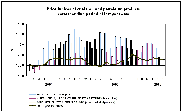 The second as for its influence on the price level growth (0.4 percentage point) was ‘transport‘; it was due to higher prices of automotive fuel by +12.4%. This increase was caused by a marked price increase of automotive fuel during the year 2005, while in the first quarter of 2006 their prices were slightly decreasing in average, probably as a reflection of a slowdown of the price growth of world prices of crude oil, import prices of ‘mineral fuels, lubricants and related materials ‘ as well as prices of industrial producers of refined petroleum products in the end of the year 2005. Prices of transport services grew by +4.7%.