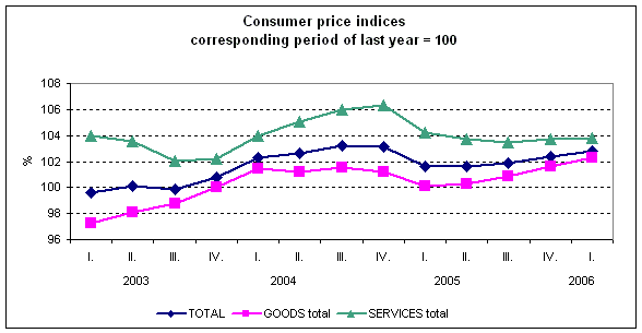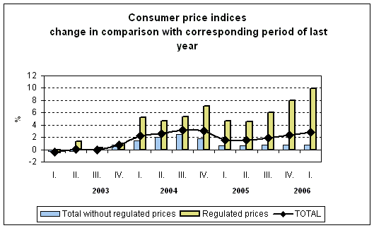 In relation to the different m-o-m increase of consumer prices in January 2006 and January 2005, the year-on-year growth of consumer prices accelerated to +2.9% in January 2006 (from +2.2% in December 2005); it influenced the price level of the entire first quarter, too. Consumer prices increased in Q1 2006 in comparison to Q1 2005 by +2.8%, which is by 0.4 percentage point more than in the Q4 2005. This development was influenced mainly by regulated prices, which grew by +9.9% (from +8.0% in Q4 2005), while market prices increased the same as in the fourth quarter by +0.7%.