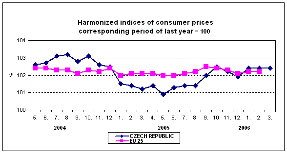 The year-on-year increment of the average harmonized index of consumer prices (HICP) in the EU 25 was +2.2% both in January and February, which is by 0.1 percentage point more than in December 2005 (the data are preliminary). The biggest growth was recorded in Latvia (+7.6% and +7.0%), while the lowest was in Poland (+0.9% in both months). In Slovakia, price growth accelerated in January and February to +4.1 and +4.3%, respectively (from +3.9% in December). In Germany, price growth stood at +2.1% from December 2005 to February 2006. In the Czech Republic, the y-o-y HICP increment increased to +2.4% in January (from +1.9% in December) and remained on that level also in February and March.