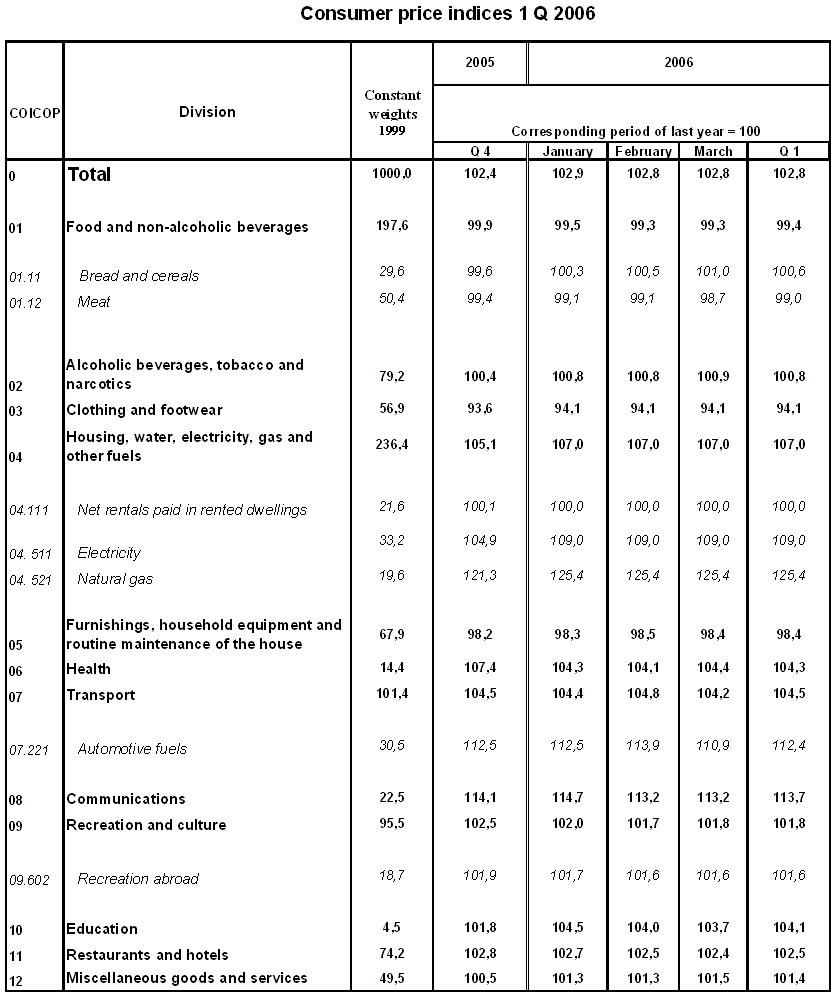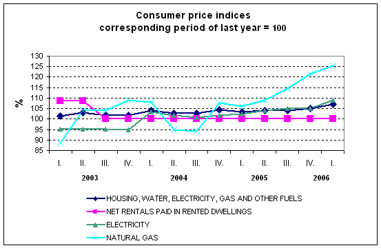 The y-o-y price growth acceleration was influenced mainly by prices in ‘housing, water, electricity, gas and other fuels‘, which recorded for some items such growth that has not been observed for several years. Prices of natural gas were higher by +25.4% y-o-y in the Q1 2006, which is the most since the fourth quarter of 2001. Prices of electricity grew by +9.0%, i.e. the most since the Q4 2002 and prices of heat and hot water grew by +10.8%, which is the biggest growth since the Q4 1998. The ‘housing, water, electricity, gas and other fuels‘ COICOP division had by far the biggest influence on the y-o-y increase of consumer prices (+1.9 percentage point).