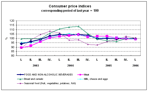 In every month of the Q1 2006, prices of ‘food and non-alcoholic beverages‘ were lower than in the corresponding period of the year 2005 and their drop was even bigger when compared to the Q4 2005. Lower by more than 5% were prices of flour, pork, butter, fruit of temperate climatic zone and sugar. On the contrary, higher than 3% were prices of baked goods, beef, dry fruit, and fresh vegetables. Prices of potatoes grew by +29.6%. Development of food prices was influenced also by the impact of markedly low farm-gate prices of agricultural producers, namely vegetable products in the year 2005.