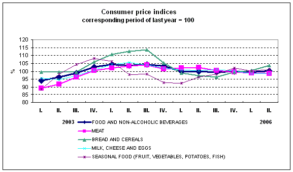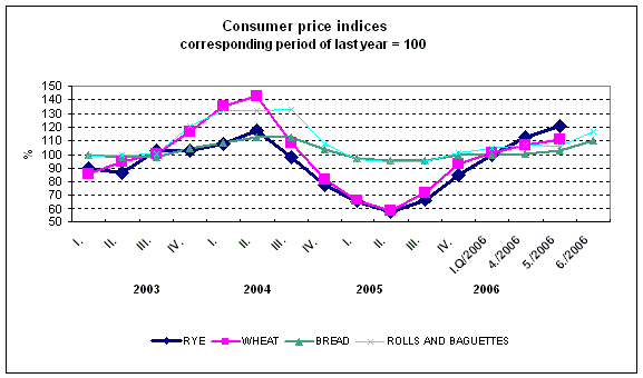 Prices of ‘bread and cereals‘ (bakery products), namely bread, rolls and baguettes increased significantly last time in Q4 2003 and Q1 2004, which was related to a price increase of cereals at agricultural producers. Consumer prices of bakery products corresponded to prices of cereals at agricultural producers also in Q1 and especially Q2 of 2006, while during the year 2005 consumer prices remained almost without reaction on the steep fall of prices of agricultural producers.