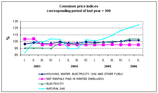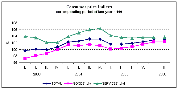 Consumer prices increased in the second quarter in comparison with the same period of the previous year by +2.9%, which is by 0.1 percentage point more than in the Q1. The overall level of consumer prices was both in the Q1 and Q2 stabilised, only in May there was a one-shot price deviation upwards. However, as for some items of consumer basket there were price fluctuations both upwards and downwards, which were sometimes marked. Price development during the second quarter was influenced mainly by a one-shot price increase of natural gas, changes in public telecommunication services, increase of prices of food and development of prices of fuels. Regulated prices increased by 10.3% (from 9.9% in Q1 2006), while market prices increased by 0.8% (in Q1 by 0.7%).